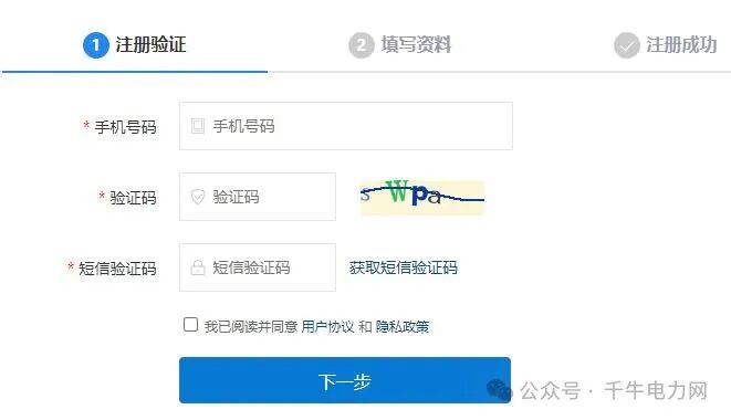 点击获取短信验证码,输入千牛电力行业门户发送的验证码,验证码有效期为3分钟;