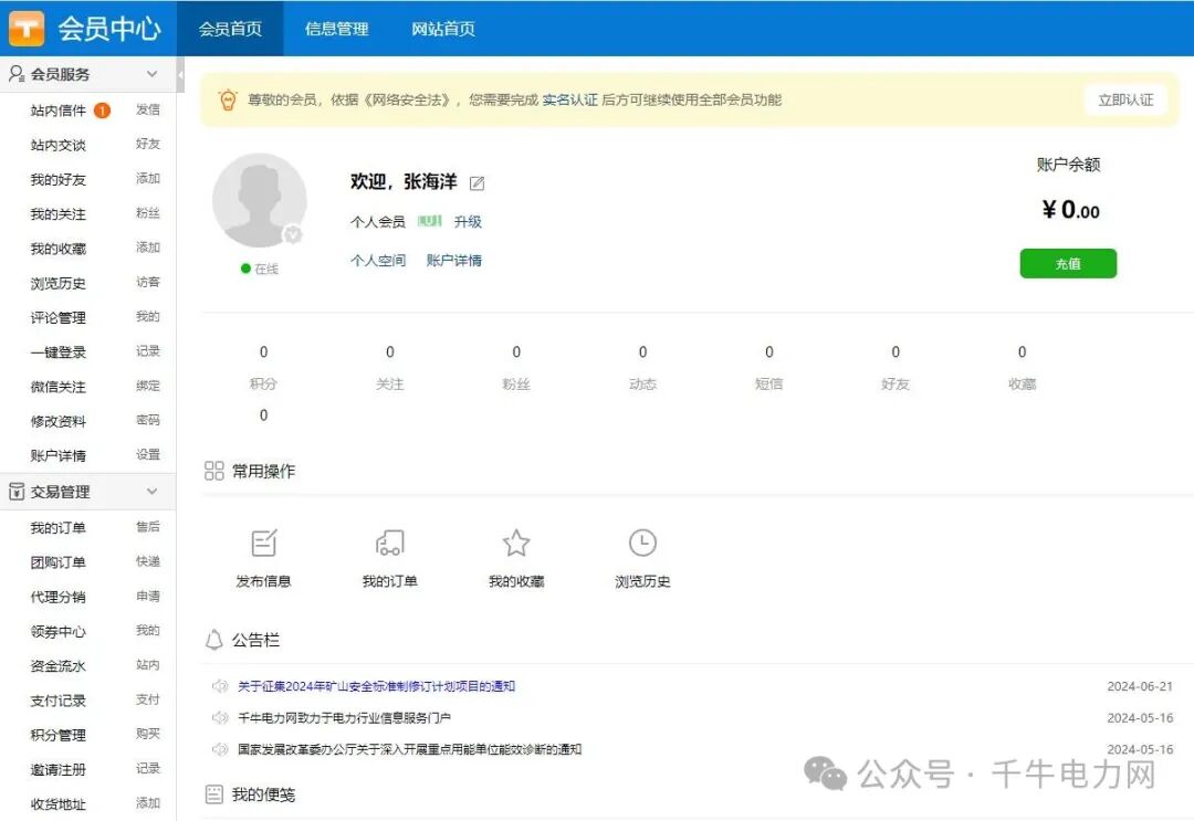 会员注册完成后,即可自动跳转至官网首页,点击右侧【会员中心】完善相关认证与信息。